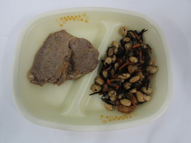 今日の給食は、ご飯、大根の味噌汁、豚肉の生姜焼き、大豆の五目煮です。