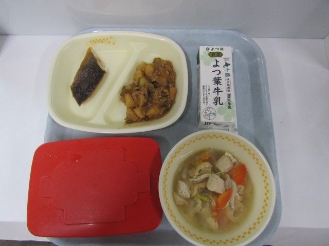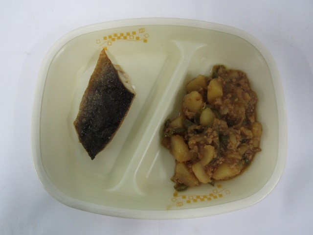 今日の給食は、ご飯、味噌けんちん汁、ほっけの塩焼き、じゃがいものピリ辛そぼろです