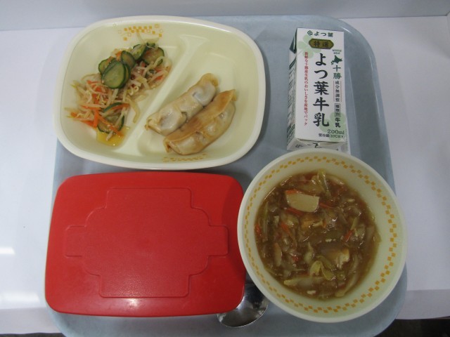 今日の給食は、ご飯、ピリ辛丼の具、焼きぎょうざ、もやしのナムルです。