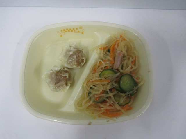 今日の給食は、ご飯、豆腐のカレー煮、肉しゅうまい、春雨サラダです。