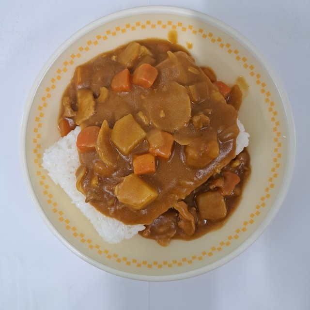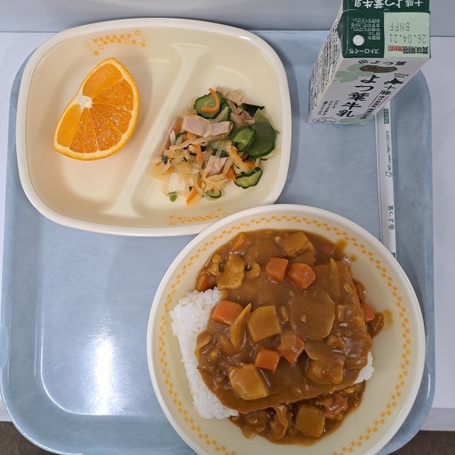 今年度はじめての給食は、ご飯、ポークカレー、大根と海藻のサラダ、オレンジでした。成長期に必要な栄養を取るため、小学校の給食に比べて量が多いです。好き嫌いせず、自分自身の体のために何でも食べましょう。836kcalでした。