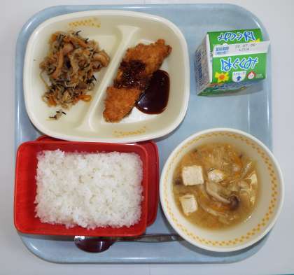 ご飯 厚揚げの味噌汁 鮭フライ 切干大根の炒め物