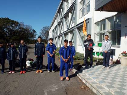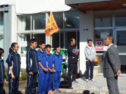 部長の児玉くんのあいさつの後、校長先生から「陸上は自分とのたたかいです。、しっかり自分を見つめて、少しでもいい結果を残せるように」という激励を受け元気に出発していきました。