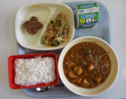 ご飯 秋野菜のカレー うさぎハンバーグ 茎わかめのサラダ