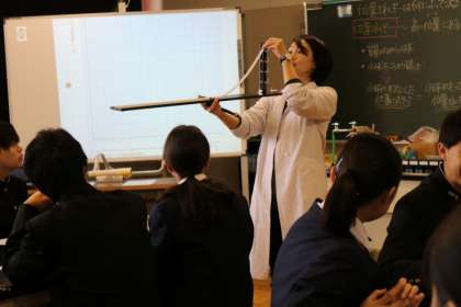 運動とエネルギーの単元、位置エネルギーは何々に影響を受け、どんな関係性があるのか、実験データを分析しながら、協力し合って課題解決に迫っています。学びに向かう意欲が素晴らしい授業でした。