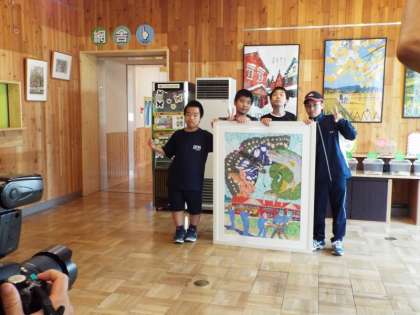 今回の校外学習の様子や、今回校外学習で栗山町より招待された経緯などが紹介され、先輩たちが作成したオオムラサキの絵と共に記念撮影をした写真が掲載されています。