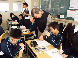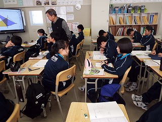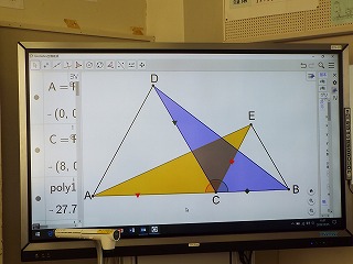 昨日と同じ三角形の合同の証明の授業でした。昨日とは先生の電子黒板で提示する図形がちょっと変わっています。先生も日々考えて教材を進化させているのですね。