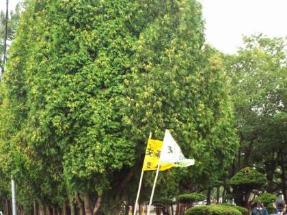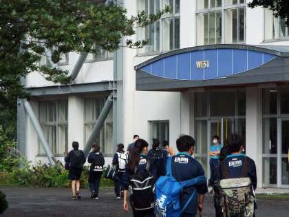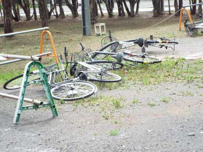 自転車で登校してきた生徒もいますが、今日は最初から自転車を倒してとめていました。