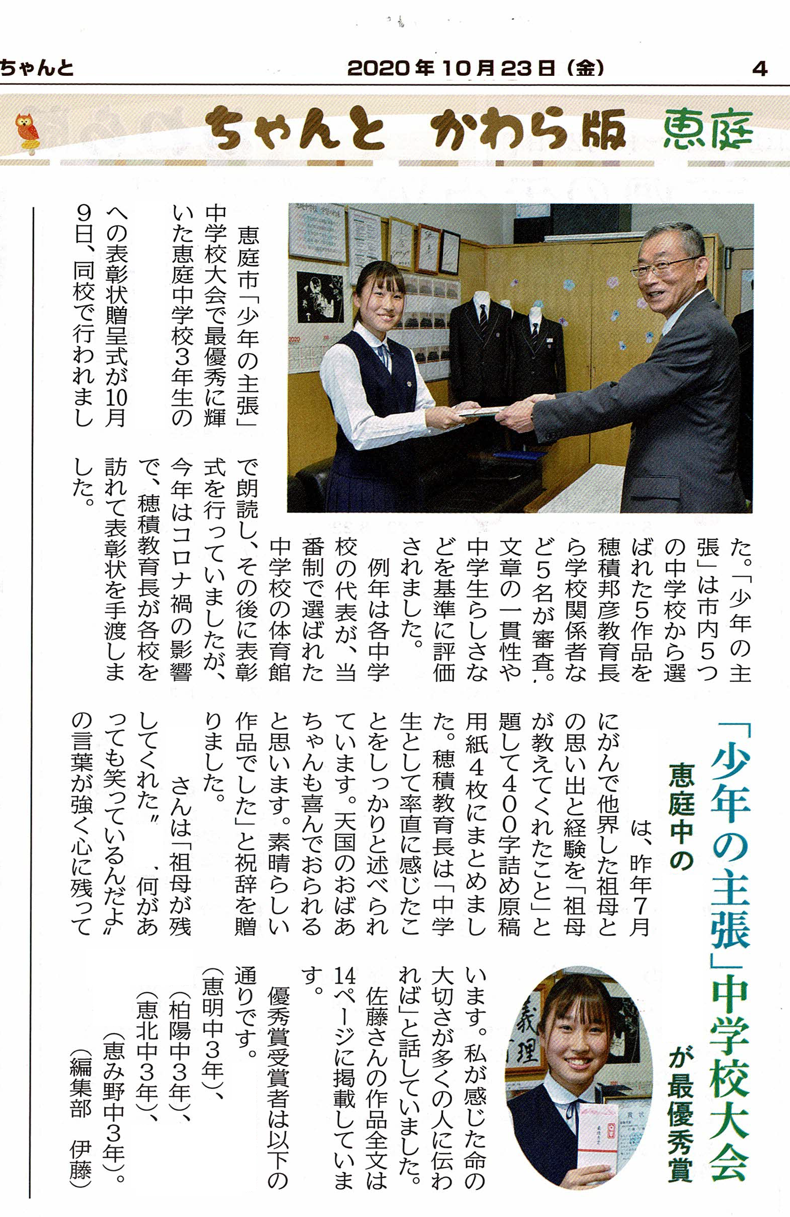 10.23.Fri.少年の主張の表彰が「ちゃんと」に載りました