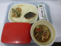 今日の献立は、ナン、バターチキンカレー、ハッシュポテト、黄桃缶、ミルメークコーヒーでした。タンドリーチキンを作る際に余ったソースにトマトやバター、生クリームを加えて作ったのが始まりといわれているバターチキンカレー。普段なかなか食べる機会はないカレーの種類かと思います。濃厚な味がナンにぴったりでした。おいしかった~。809kcalでした。
