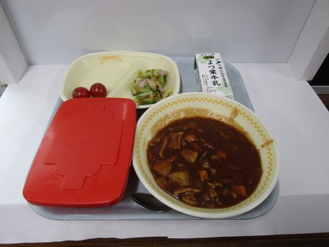 今日の給食は、ご飯、ハヤシライス、茎わかめサラダ、ミニトマトです。