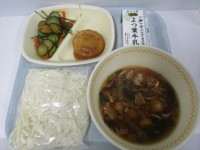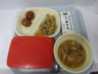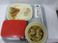 今日の給食は、ご飯、チキンカレー、ほうれん草と大根のサラダ、パイン缶です。
