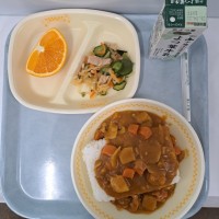 今年度はじめての給食は、ご飯、ポークカレー、大根と海藻のサラダ、オレンジでした。...