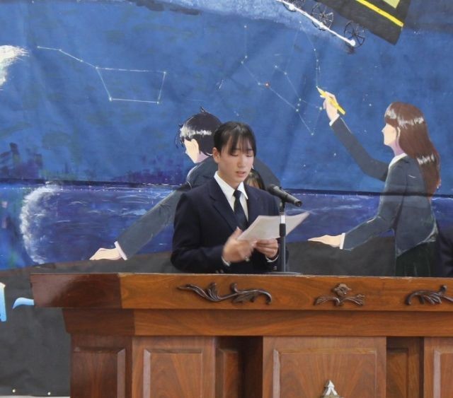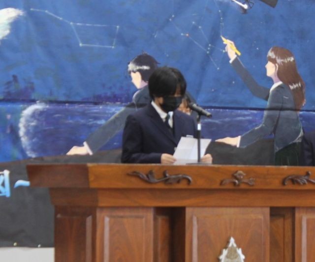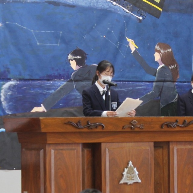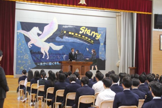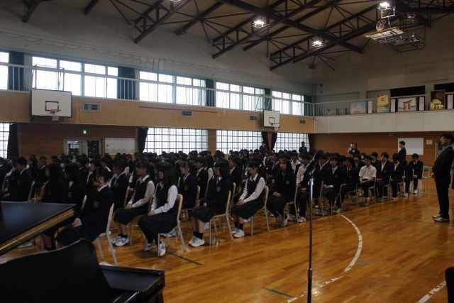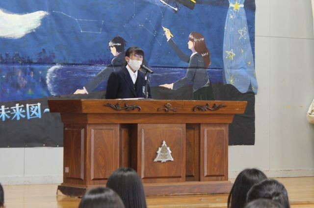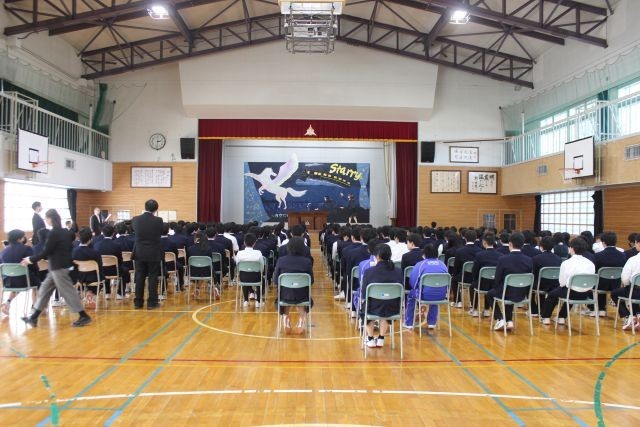 5校時までの授業を終えた全校生徒が体育館に集い、各学年代表の生徒から「前期の反省」の発表がありました。