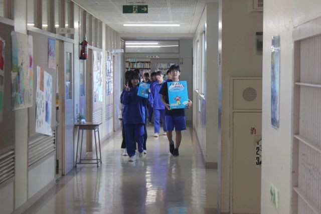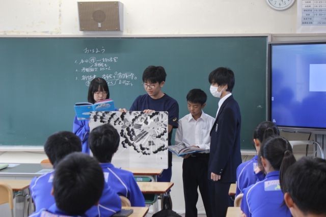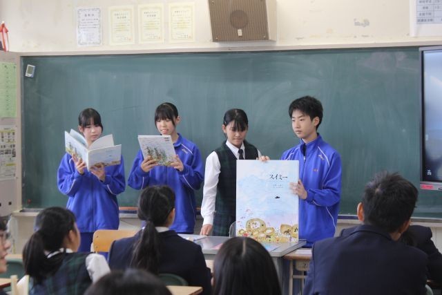 この日のために委員会の活動として練習を重ねてきた委員さんたちが、7日は各学年A組、9日はB組の朝読書の時間に訪問して「絵本の読み聞かせ」を行いました。いつもとは違った雰囲気の中、交流学級で朝の時間を共に過ごしているE組の生徒も含めて、みんなで読み聞かせを楽しんだ様子でした。