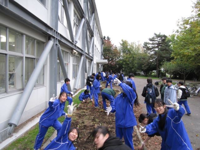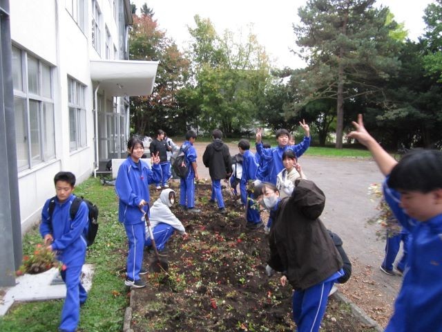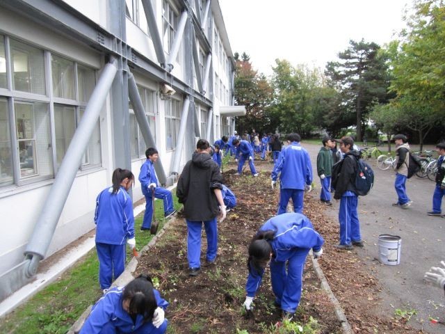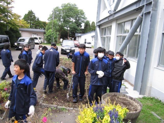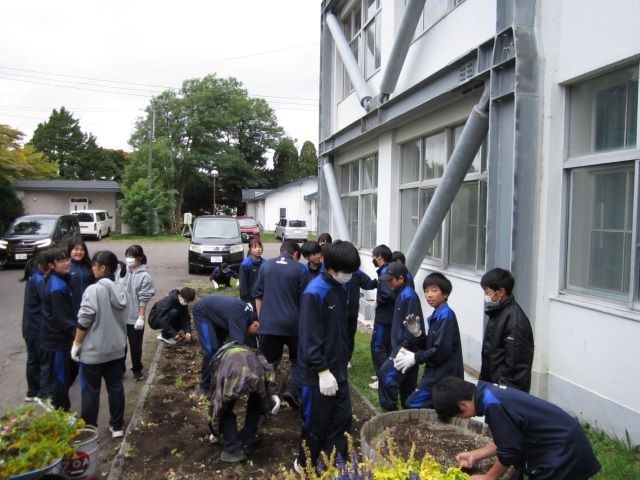 16日(木)の放課後に、保健整美委員会主催で、校舎前庭の花壇整理が行われました。