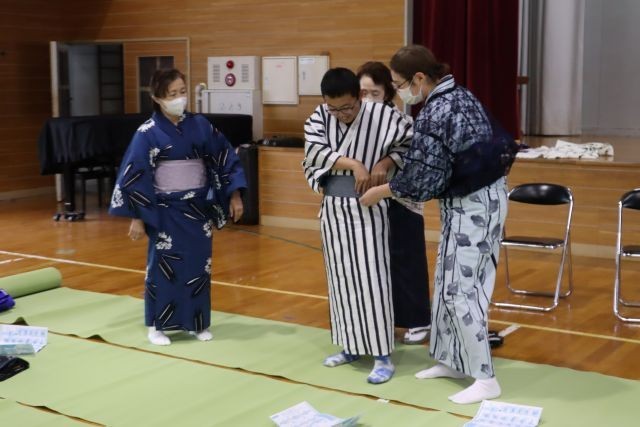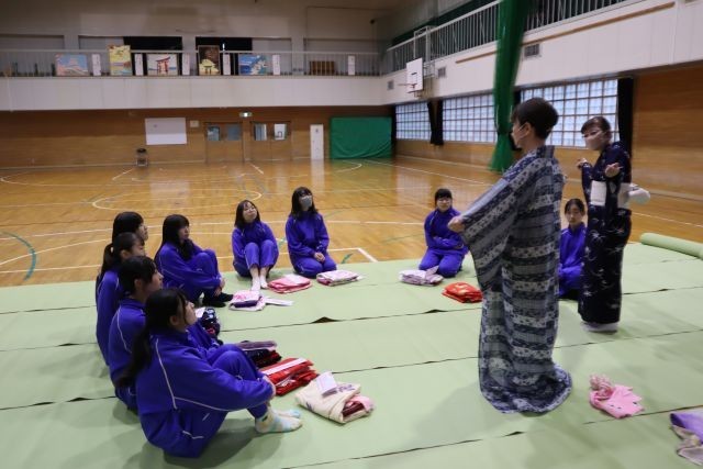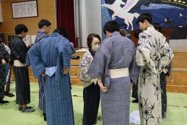 10日(月)、2年生家庭科の授業で「浴衣の着付け」教室を行いました。