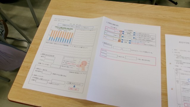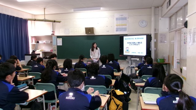 1年生は「中学生の望ましい食生活について考えよう」、E組は「健康な体作りについて考えよう」、2年生は「健康な体づくりと食事について考えよう」をテーマに、1時間あっという間の講義となりました。保健体育や家庭科の授業内容の復習部分もありました。