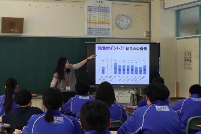 25日(火)1年生とE組、26日(水)は2年生の各学級で、恵庭市栄養教諭の先生を講師にお招きし、「食育」授業が行われました。