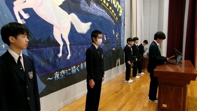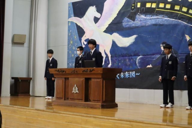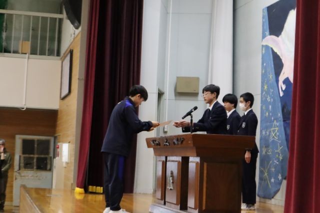 5校時は全校集会。前段、市民憲章作文コンテスト、中学校作文コンクール、JDMA創造性コンテストの表彰が行われたあと、生徒会主催の「GL集会」となりました。GL(good life)強調週間の活動反省が各委員会委員長から報告されたあと、校長先生の「時を守り」「場を清め」「礼を正す」ということばをキーワードにしたお話がありました。