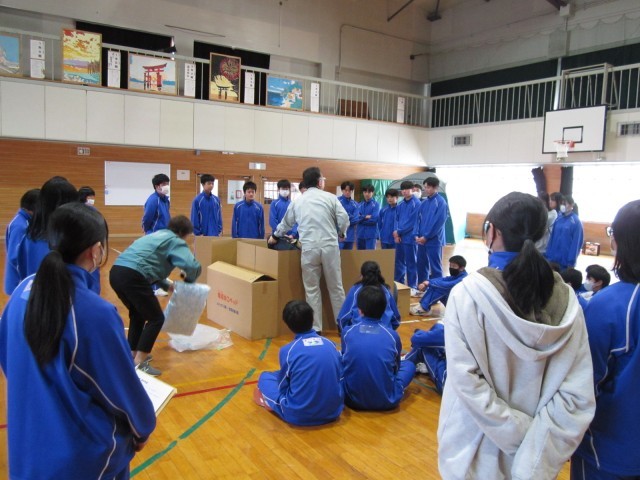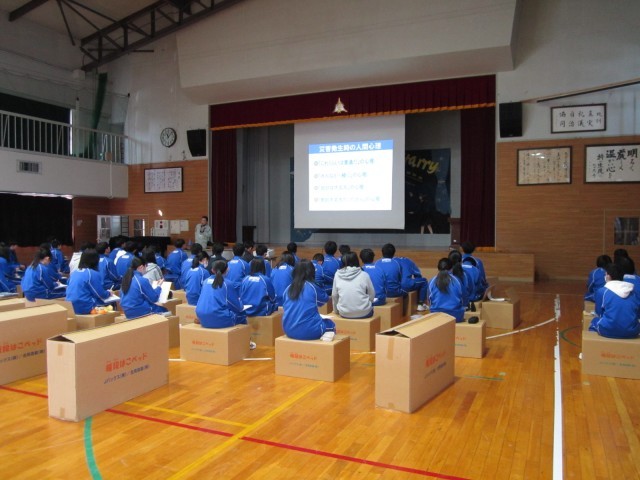 恵庭市基地・防災課からお招きした講師の方の講話の前に、自分たちで「段ボールベッド」のパーツとなる「椅子」を作成しました。床に座るよりもはるかに暖かく、楽な姿勢で集中して防災に関するお話を聞くことができました。
