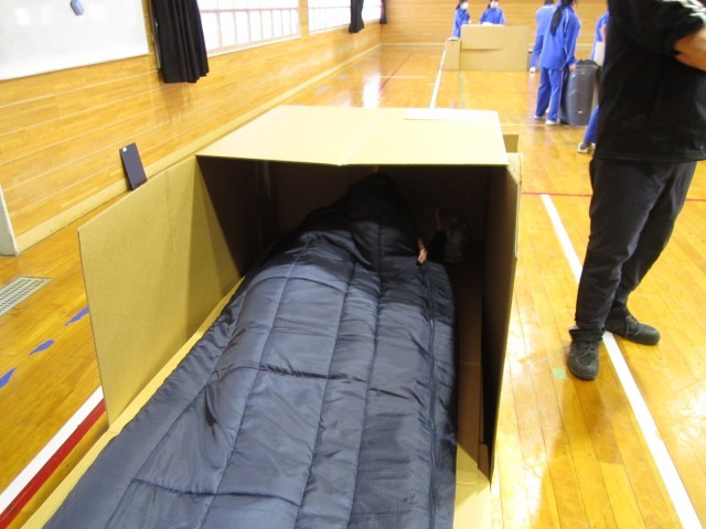 休憩時間をはさんで、後半は先ほど椅子として使用したパーツを組み合わせて、「段ボールベッド」やパーティションを作り、寝心地なども体験しました。ほかにも災害に備えた簡易テントや、進化した災害用のトイレにも触れる(?)ことができました。
