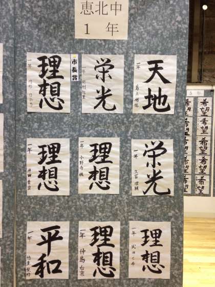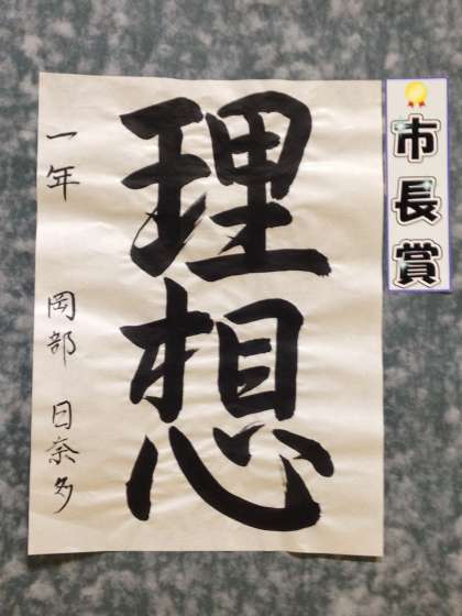 1.31.Mon 恵庭市小中学校書写展 公開日 2017/02/01 更新日 2017/02/01 お知らせ 1月28日(土)〜31日(火)まで、夢想館で行われていた恵庭市小中学校書写展において1年生の岡部日奈多さんの作品が市長賞を受賞しました。