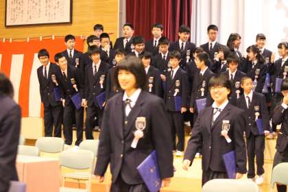 たくさんのご来賓の方のご出席をいただき、第68回卒業証書授与式が行われました。学校長から卒業生一人一人に卒業証書を手渡し、原田市長、小原PTA会長からご祝辞をいただきました。卒業生と在校生交歓の中では在校生による合唱・お祝いの言葉、卒業生からのお別れの言葉、全校合唱、最後に卒業生による合唱で別れを惜しみました。卒業生83名の門出を祝した、厳粛な中にも温かみのある感動的な卒業式となりました。式の後は、教室にもどり保護者の見守る中、担任と卒業生の最後の学活が行われ、それぞれの思いを伝え合いました。・・・夢と希望をもって新たな生活をスタートさせていってほしいと思います。