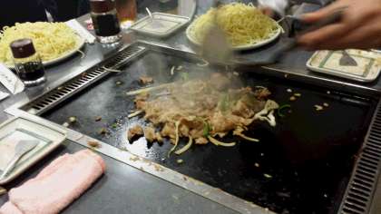 昼食は月島もんじゃ焼きです。4人1卓のグループでいただいています。東京名物に舌鼓です。