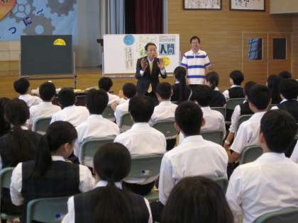 7.13ヒューマン・コミュニケーション講座 公開日 2017/07/13 更新日 2017/07/13 お知らせ 12・13日の二日間にわたり、ヒューマン・コミュニケーション講座が行われました。違いを持つ一人ひとりが、お互い気持ちよく過ごすためには、お互いが他者とどう向き合い、関わり合い、わかり合うのかを学ぶ授業を、大学の先生を講師に迎え、1・2年生が学びました。