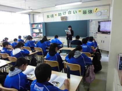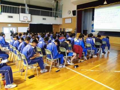 16日に行われた参観日の参観授業として、全校で道徳を行いました。1年生は「家族愛」をテーマにした道徳、2年生は視聴覚機器を使用しながら深めていく道徳を、E組では命にかかわる道徳など行いました。3年生は体育館で学年道徳として講師の方を招いてのマナーに関する道徳を行いました。受験に関わる内容もあり、一所懸命にメモを取りながら取り組んでいました。多数の保護者の方が来ていただいた中、いつもの学習のようすを見ていただけたと思います。