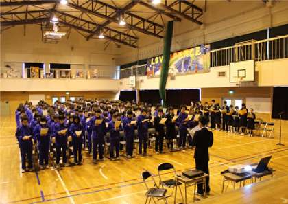12月15日(金)、生徒会が企画・運営した、いじめ撲滅に向けたハート&ハート集会が行われました。生徒会役員がいじめの劇を演じたり、いじめについてのビデオ上映をして、「いじめを絶対に許さない」というメッセージを全校生徒に訴えました。集会の最後に、「恵北中学校いじめ撲滅宣言」を採択し、全校生徒で宣言文を読み上げました。また、学級でいじめに対する一人一人の思いをハート型の用紙に書き、いじめのない明るい学校にしていこうと誓い合いました。