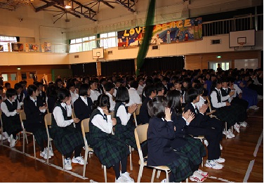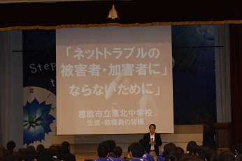 5校時、KDDI株式会社コーポレート総括本部の大久保輝夫氏を講師にお招きし、全校生徒を対象に安全教室を行いました。具体的な事例や動画からネットトラブルの被害者、加害者にならないために、多くのことを学びました。生徒も真剣に聞き、改めてラインやツィッターなどの活用や危険性について考えることができた、有意義な安全教室となりました。