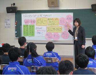 5,6校時、柏陽中学校の加嶋先生を講師にお招きし、1年生を対象に、ヒューマン・コミュニケーション講座を実施しました。「そばにいる人と気持ちよく過ごすためには?」をテーマに、コミュニケーションを深めるためには、「きく」「見る」「体の向き」「あいさつ」「相づち」「表情」が大切であることを学び、実際に友達と向き合い、会話をする体験をしました。生徒の積極的に話し合いをしている姿、明るい笑顔が印象的でした。
