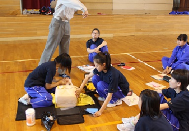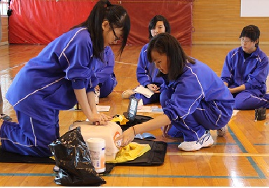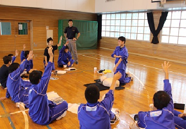 8.28救命救急講習会 公開日 2018/08/28 更新日 2018/08/28 お知らせ 1〜4校時の保健体育の時間に2年A組を対象に、消防署の方々を講師にお招きし、救命救急講座が行われました。生徒は、消防署の方のお話を真剣に聞き、心肺蘇生法やAEDの使い方について学習し、実際にやってみました。明日29日は、2年B組を対象に行う予定です。