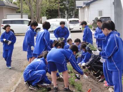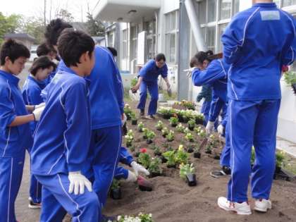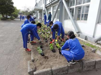 強風で土埃の上がる中、係、委員会、生徒会役員による苗植えが行われました。お疲れさまでした。