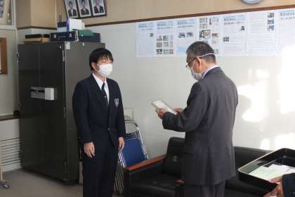 例年、中学校会場で開催される恵庭市「少年の主張」中学校大会ですが、今年度は新型コロナウイルスの関係で書面による論旨のみの審査となりました。本校3年生の作品が優秀賞に選ばれ、本日、恵庭市教育委員会より穂積邦彦教育長にお越しいただき表彰が行われました。作品は「ちゃんと」恵庭市と青少年育成市民の会の共催で発行する「秋の青少年育成強調月間チラシ」にて紹介される予定です。