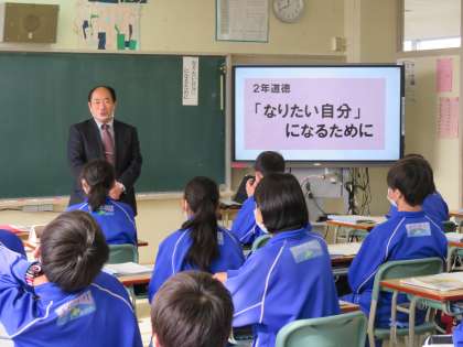校長先生が1,2年生にむけて道徳の授業を行いました。将来なりたい自分について考え、今の自分には何ができるのか、何をしていくべきなのかを考えました。授業を受けた生徒の感想には「なりたい職業のために今から勉強を頑張る。」「日ごろから努力する習慣をつける。」と将来を見据えた考えが多く見られました。明日は3年生のそれぞれの学級で校長先生が授業を行います。