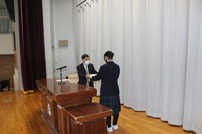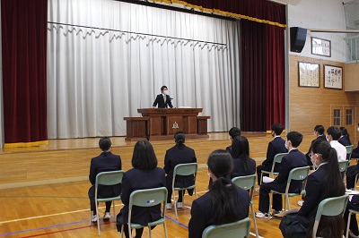 卒業式が3日後に迫りました。今日の1時間目は同窓会入会式。時節柄大変お忙しい中、東野義弘同窓会長と浜野晋輔同窓会幹事長にお越しいただき、ご挨拶とご説明をいただいた後、記念品贈呈が行われました。脈々と続く恵北中学校同窓会の歴史に、この度、新たに今年度の卒業生64名が加わることになります。