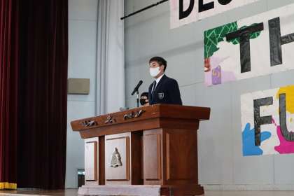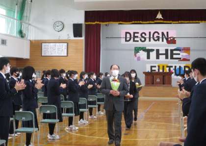 修了式・離任式が行われました。修了式では、代表生徒が今年度の成果と次年度に向けた目標を発表しました。スタートが肝心です。春休みから次の学年を意識して、しっかりと準備をしましょう。離任式では、校長先生が日ごろから生徒たちに伝えている「和顔愛語」の文字通りの明るい笑顔と、温かい拍手で3名の先生方が見送られました。