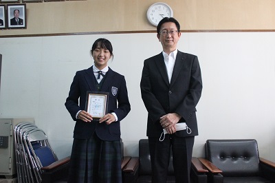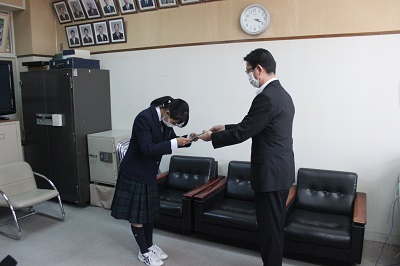 今年の恵庭市「少年の主張」中学校大会はコロナ禍により録画審査で開催されました。本校3年生の作品は優秀賞に選ばれ、本日、恵庭市教育委員会より岩渕隆教育長様にお越しいただき表彰が行われました。優秀賞受賞、おめでとうございます。