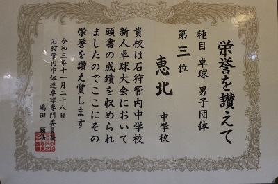 昨日開催された管内中学校新人卓球大会の男子団体戦で3位入賞という好成績を収めました。選手、関係者の皆さま、おめでとうございます。更なる高みの実現に強い気持ちで挑めるよう、一層の心技体の充実を目指した活動を期待します。