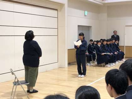 12月26日に離任される、学校補助員の 内野 亜紀 先生のお別れ集会が2年生の学年集会で行われました。指導の的確さと温厚で親しみやすいその人柄で、我々教員からはもちろん、生徒からも厚く信頼されている内野先生。本当に感謝の気持ちでいっぱいです。内野先生、本当にありがとうございました。