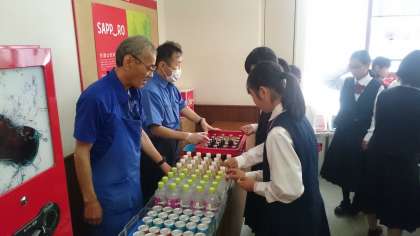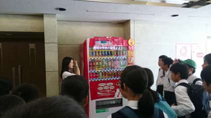 まずは「〜恵明中学校の皆さま〜」と電工表示された自動販売機の歓迎を受け、皆で感激。その後、工場内を見学させていただき、製造行程や自動化された倉庫のシステムについて学びました。