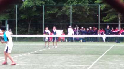 生憎の天候ですが、ようやく恵明中としての第一試合 金子・迫ペアの試合が始まるところです。