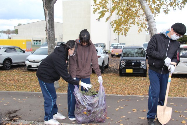花苗を抜き、土を落とし、ボランティア袋に入れて運搬したり、抜いた後の花壇をきれいに整地するなど、生徒全員で協力して作業しました。