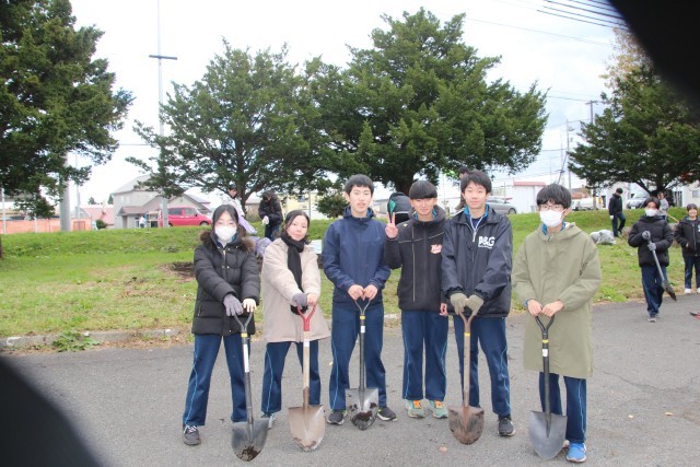 全校生徒で、校舎前と戸磯線植樹升の花壇撤去作業を行いました。