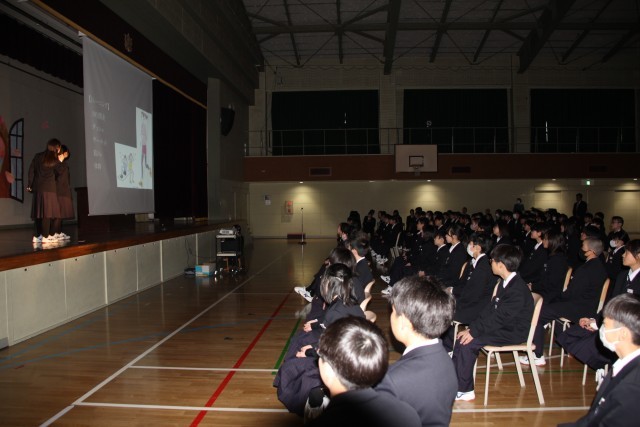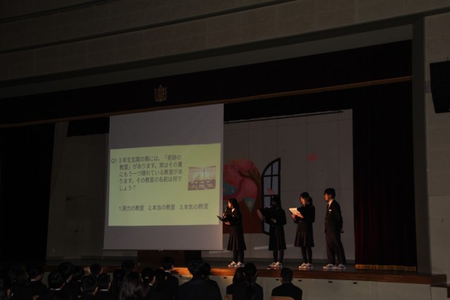 生徒会役員、各部活動の部員が様々な準備をする中、昨日入学してきた1年生に向けて、対面式を行いました。2・3年生が、生徒会活動や中学校の生活の様子、部活動などについてわかりやすく、楽しく、工夫を凝らして説明しました。