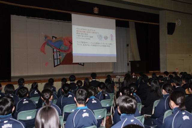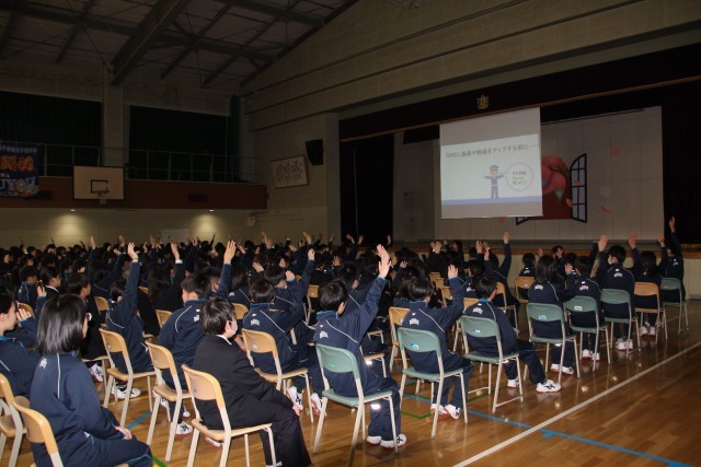 5校時目に、「ネットトラブル防止教室」を開催しました。全校生徒が体育館に集まる中、講師に「ほっかい法律事務所」の 弁護士 樋口 紗弥 氏をお招きし、SNS やネットに関わる危険について、具体的な事例を基にお話していただきました。